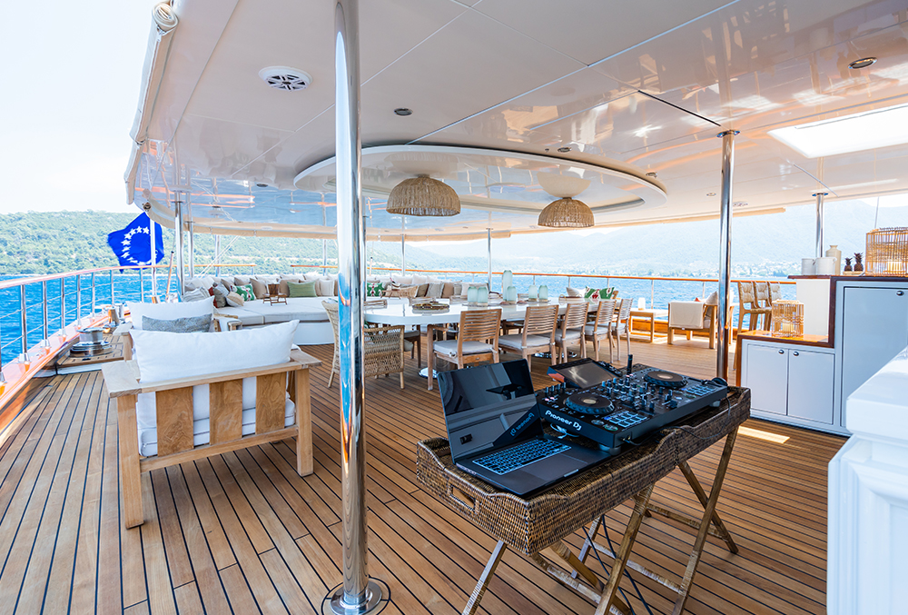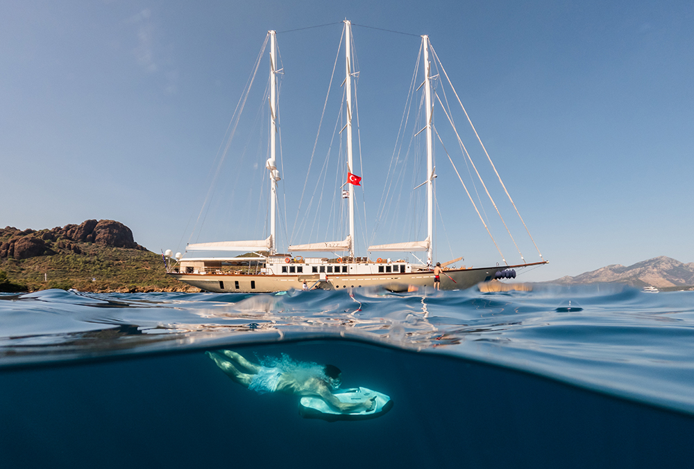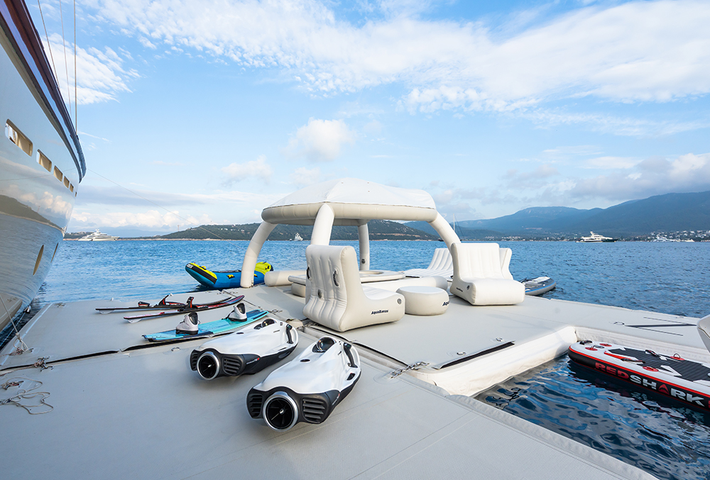 and from the shore, whilst also having a large RIB tender for towing waterskis and inflatables for the adventurous guests.